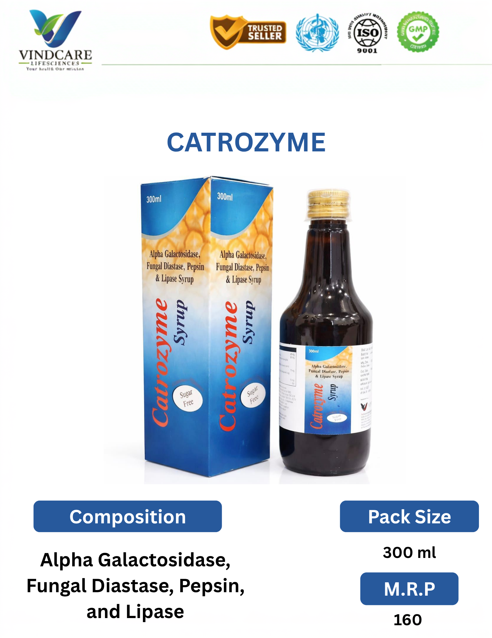 Catrozyme is a comprehensive digestive enzyme syrup formulated to support healthy digestion and nutrient absorption. It helps break down complex carbohydrates, proteins, and fats.